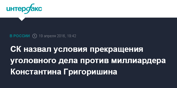 Москва. 19 апреля. INTERFAX.RU - Дело в отношении российского миллиардера украинского происхождения Константина Григоришина, обвиняемого в организации ухода от налогов почти на 675 млн рублей, может быть прекращено, сообщил следователь СК РФ.