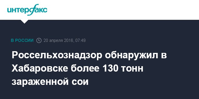 Москва. 20 апреля. INTERFAX.RU - Специалисты Россельхознадзора по Хабаровскому краю и Еврейской АО выявили крупную партию зараженной сои в Хабаровске, сообщает пресс-служба ведомства в среду.