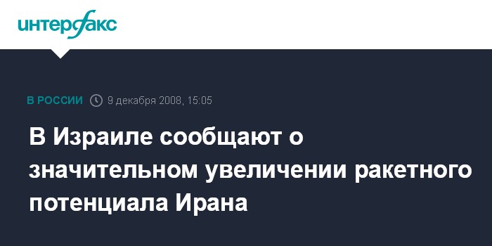 Москва. 9 декабря. INTERFAX.RU - Количество ракет большой дальности увеличилось в Иране за 2008 год более чем в три раза. Такие данные привел 10-й канал израильского телевидения.