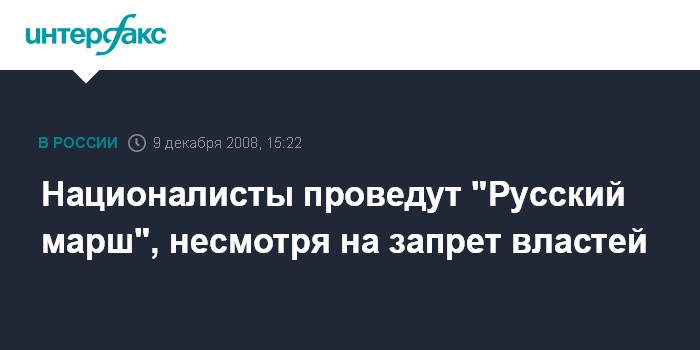 Москва. 9 декабря. ИНТЕРФАКС - Лидеры ряда националистических организаций решили не отказываться от планов проведения так называемого "Русского марша" 12 декабря - в День Конституции России.