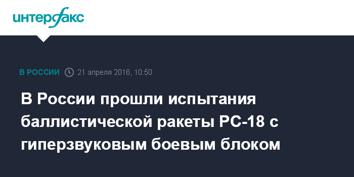 "Во вторник из позиционного района в Оренбургской области выполнен пуск МБР РС-18 (по западной классификации - "Стилет") с целью испытаний перспективного боевого оснащения - гиперзвукового летательного аппарата. Испытания признаны успешными", - сообщил собеседник агентства.