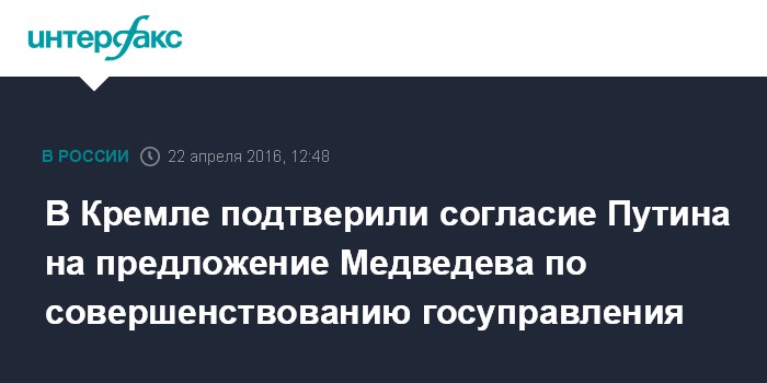 Москва. 22 апреля. INTERFAX.RU - Пресс-секретарь президента РФ Дмитрий Песков подтвердил, что Владимир Путин дал согласие проработать предложенную премьером РФ Дмитрием Медведевым инициативу начать реформу системы государственного управления.