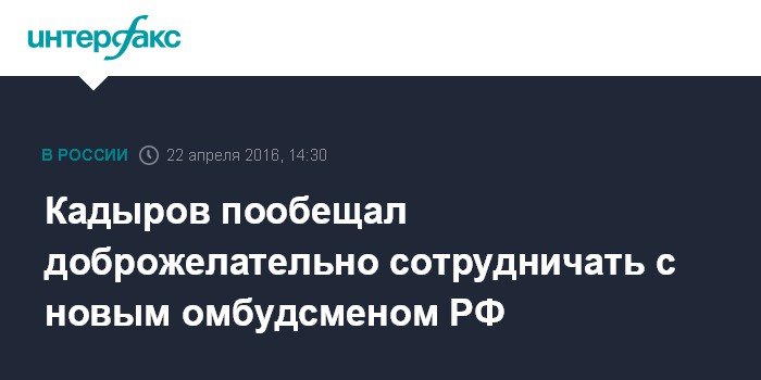 Москва. 22 апреля. INTERFAX.RU - И.о. главы Чеченской республики Рамзан Кадыров готов встретиться с новым уполномоченным по правам человека в РФ Татьяной Москальковой и наладить с ней тесное сотрудничество.