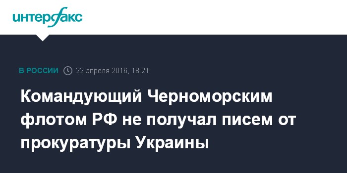 Москва. 22 апреля. INTERFAX.RU - Командующий Черноморским флотом (ЧФ) ВМФ России адмирал Александр Витко не получал никаких писем и уведомлений от прокурорских работников Украины, информирует Минобороны РФ.
