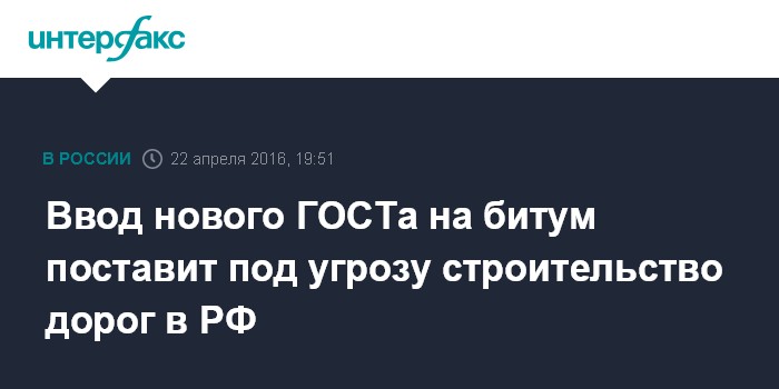 Москва. 22 апреля. INTERFAX.RU - Ввод нового стандарта качества дорожных битумов с сентября 2016 года может привести к серьезному дефициту этого продукта на рынке и проблемам в строительстве дорог уже с 2017 года.