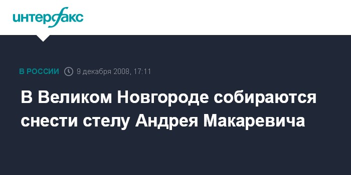 Москва. 9 декабря. INTERFAX.RU - До конца текущей недели в Великом Hовгороде должна решиться судьба стелы возле областного театра драмы им. Достоевского, известная как Колонна Макаревича, сообщили "Интерфаксу" в комитете культуры, туризма и архивного дела Hовгородской области.