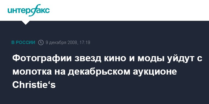 Москва. 9 декабря. INTERFAX.RU - Коллекция редких фотографий знаменитостей кинематографа и мира моды будет выставлена на нью-йоркских торгах Christie‘s 16-17 декабря.