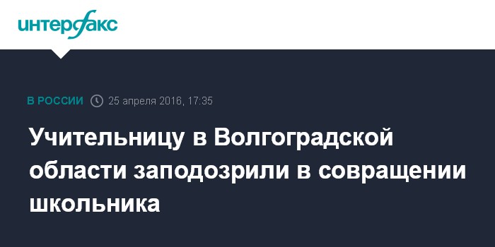 Москва. 25 апреля. INTERFAX.RU - В городе Волжский (Волгоградская область) 28-летняя учительница начальных классов подозревается в интимной связи с 15-летним школьником, сообщила пресс-секретарь регионального управления СКР Наталия Куницкая.