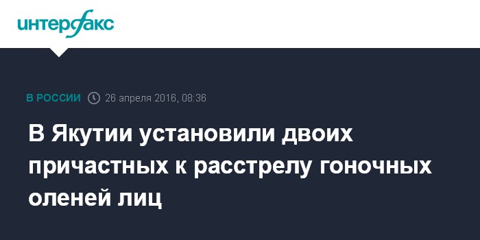 Москва. 26 апреля. INTERFAX.RU - Виновники массового расстрела гоночных оленей в Якутии будут установлены в ближайшие дни, сообщил глава МВД Якутии Владимир Прокопенко.