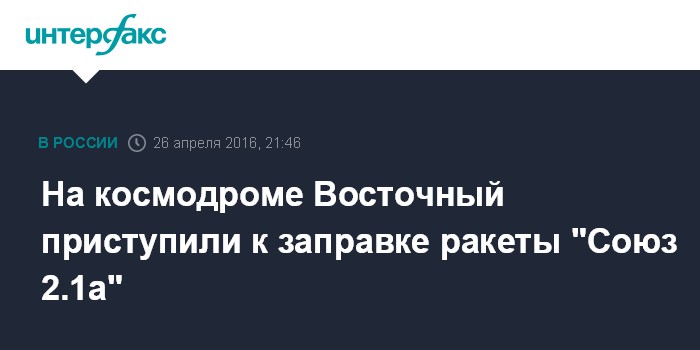 Москва. 26 апреля. INTERFAX.RU - На космодроме Восточный специалисты приступили к операциям по заправке "Союза 2.1а" - первой ракеты-носителя, которая стартует с космодрома.