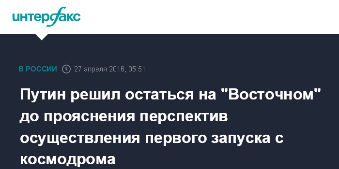 Москва. 27 апреля. INTERFAX.RU - Президент РФ Владимир Путин посетил космодром "Восточный" в среду и принял решение задержаться до момента как будет прояснена ситуация с переносом первого пуска ракеты-носителя.