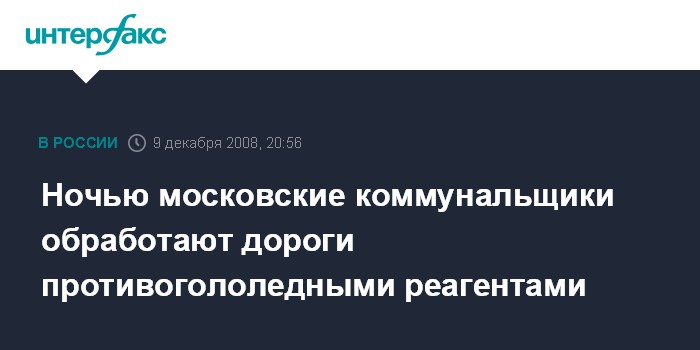 Москва. 9 декабря. INTERFAX.RU - В связи с ожидаемым понижением температуры дорожные службы проведут ночью сплошную обработку противогололедными реагентами московских дорог, сообщил "Интерфаксу" источник в комплексе городского хозяйства во вторник. Он уточнил, что в этой работе будут принимать участие 440 специальных машин-распределителей.
