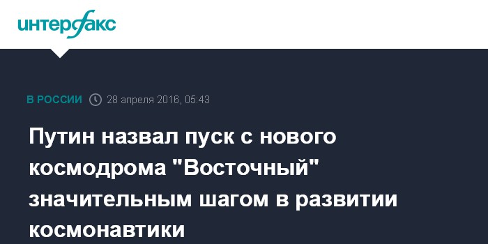 Москва. 28 апреля. INTERFAX.RU - Президент России Владимир Путин поздравил "Роскосмос" и строителей космодрома Восточный с успешным запуском ракеты-носителя в четверг.