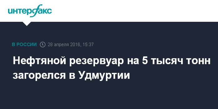 Москва. 28 апреля. INTERFAX.RU - В Удмуртии на Гремихинском месторождении в четверг днем загорелся нефтяной резервуар, сообщили агентству "Интерфакс" в пресс-службе управления.