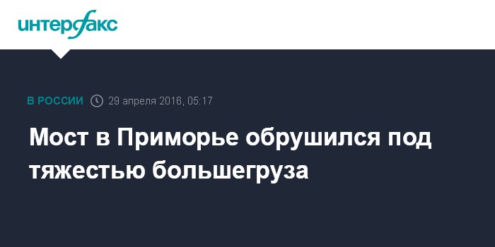 Москва. 29 апреля. INTERFAX.RU - Один из двух пролетов моста обрушился на трассе между поселка Яковлевка и Кировка в Приморье. По данным краевого департамента гражданской защиты, очередная авария с мостом произошла вечером 28 апреля. Частично пострадало основание моста и дорожное полотно.