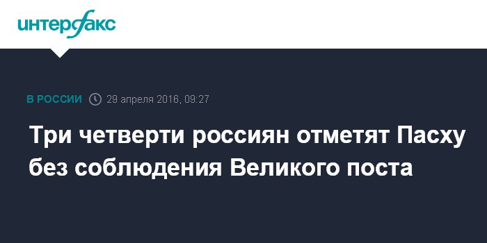 Москва. 29 апреля. INTERFAX.RU - Большинство россиян (75% в целом и 72% тех, кто идентифицирует себя как православных) сохранили обычный режим питания во время Великого поста, который в этом году завершится 30 апреля. При этом так или иначе отмечать Пасху 1 мая будут более 60% россиян, сообщили "Интерфаксу" в "Левада-Центре".