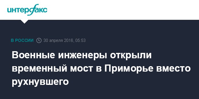 Москва. 30 апреля. INTERFAX.RU - Инженеры Восточного военного округа (ВВО) в торжественной обстановке открыли у села Новолитовск в Приморье временный мост на месте рухнувшего 23 февраля.
