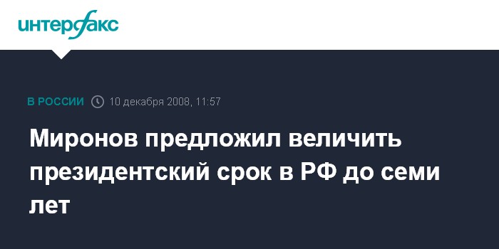 Москва. 10 декабря. INTERFAX.RU - Спикер Совета Федерации РФ Сергей Миронов высказывается за увеличение срока полномочий главы государства до семи лет.