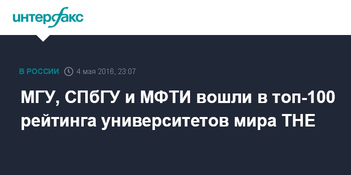 Москва. 4 мая. INTERFAX.RU - Третий российский вуз - Московский физико-технический институт (государственный университет, МФТИ) - вошел в первую сотню репутационного рейтинга вузов британского журнала Times Higher Education (THE World Reputation Ranking 2016). Результаты издание публикует вечером в среду.