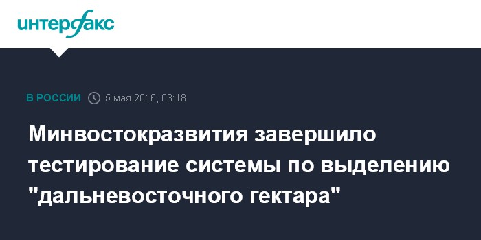Москва. 5 мая. INTERFAX.RU - Министерство по развитию Дальнего Востока завершает опытную эксплуатацию информационной системы по выделению гражданам земельных участков в рамах закона о "дальневосточном гектаре".