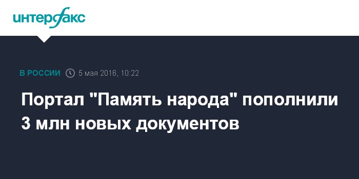 Москва. 5 мая. INTERFAX.RU - Портал министерства обороны РФ "Память народа" пополнился более чем на 3 млн новых сведений накануне Дня Победы, сообщает управление пресс-службы и информации военного ведомства.