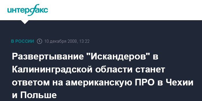 Москва. 10 декабря. INTERFAX.RU - Планы развертывания ракетных комплексов "Искандер" в Калининградской области являются ответным шагом на строительство баз американской системы противоракетной обороны в Чехии и Польше, заявил начальник Генштаба Вооруженных сил РФ генерал армии Николай Макаров.