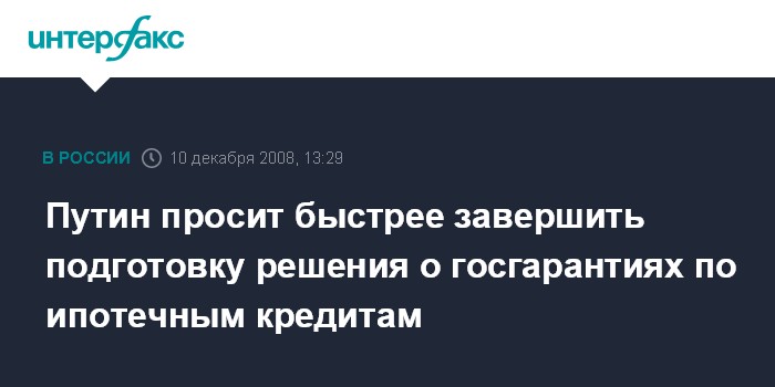 Москва. 10 декабря. INTERFAX.RU - Председатель правительства РФ Владимир Путин просит быстрее завершить все формальные процедуры, связанные с реализацией решения правительства о системе госгарантий по ипотечным кредитам, для тех случаев, когда из-за кризиса граждане утратили работу или значительную часть своего заработка.