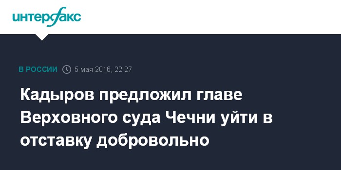 Москва. 5 мая. INTERFAX.RU - Глава Чеченской республики Рамзан Кадыров предложил председателю Верховного суда региона Магомеду Каратаеву добровольно уйти с занимаемой должности.
