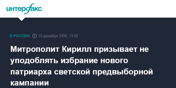Москва. 10 декабря. INTERFAX.RU - Выборы нового патриарха Московского и всея Руси не должны уподобиться светской предвыборной кампании и внести разделения в церковную жизнь, считает патриарший местоблюститель митрополит Смоленский и Калининградский Кирилл.