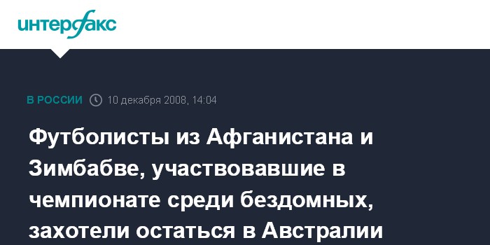 Москва. 10 декабря. INTERFAX.RU - Не менее 15 участников мирового чемпионата по футболу среди бездомных, который прошел в этом году в Австралии, обратились к властям страны с просьбами о предоставлении убежища, сообщает в среду австралийская газета "Геральд сан".