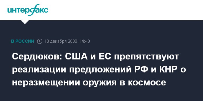 Москва. 10 декабря. INTERFAX.RU - Реализации предложений Москвы и Пекина о неразмещении оружия в космическом пространстве препятствует позиция, занимаемая США и Евросоюзом - такого общего мнения придерживаются Россия и Китай, заявил в среду в Пекине министр обороны РФ Анатолий Сердюков.