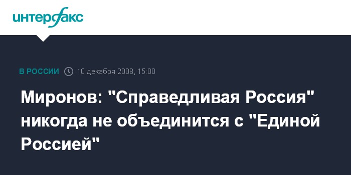 "Никогда мы не войдем в "Единую Россию", потому что наша партия находится в оппозиции к "Единой России", идеологической оппозиции. Поэтому ни о каком слиянии, о вхождении речи быть не может", - сказал С.Миронов в среду на заседании Саратовской областной думы, отвечая на вопрос одного из депутатов. "А то, что мы поддержали единого кандидата (на выборах президента РФ в 2008 году "Справедливая Россия" поддержала Дмитрия Медведева - ИФ), это нормальная практика", - отметил спикер.