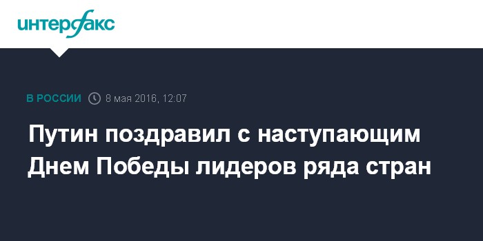 Москва. 8 мая. INTERFAX.RU - Президент России Владимир Путин поздравил лидеров Азербайджана, Армении, Белоруссии, Казахстана, Киргизии, Молдавии, Таджикистана, Туркменистана, Узбекистана, Абхазии, Южной Осетии, а также граждан Грузии и Украины с 71-й годовщиной Победы в Великой Отечественной войне, сообщила пресс-служба Кремля.
