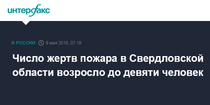 Москва. 9 мая. INTERFAX.RU - Число погибших при пожаре в городе Сухой Лог (Свердловская область) возросло до девяти человек, сообщили в Следственном управлении СКР РФ по Свердловской области.