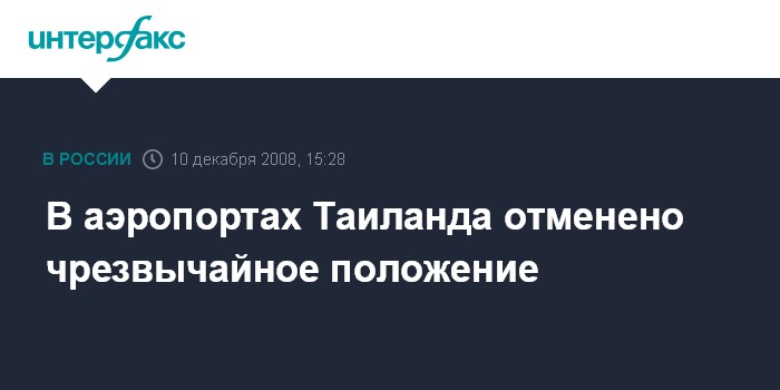 Москва. 10 декабря. INTERFAX.RU - Переходное правительство Таиланда отменило режим чрезвычайного положения в аэропортах Суварнабхуми и Дон Муанг, сообщает в среду таиландская газета Nation. Кабинет министров пришел к выводу, что необходимость в режиме чрезвычайного положения отпала, после того, как ситуация нормализовалась, заявил пресс-секретарь правительства Таиланда.