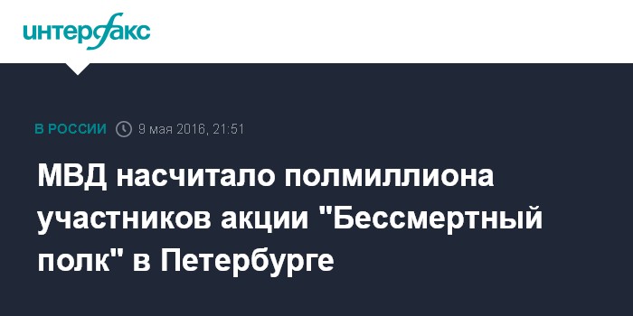 Москва. 9 мая. INTERFAX.RU - Акция "Бессмертный полк" в Санкт-Петербурге в понедельник собрала 500 тысяч участников, в Ленинградской области - более ста тысяч человек, сообщили "Интерфаксу" в пресс-службе ГУ МВД по региону.