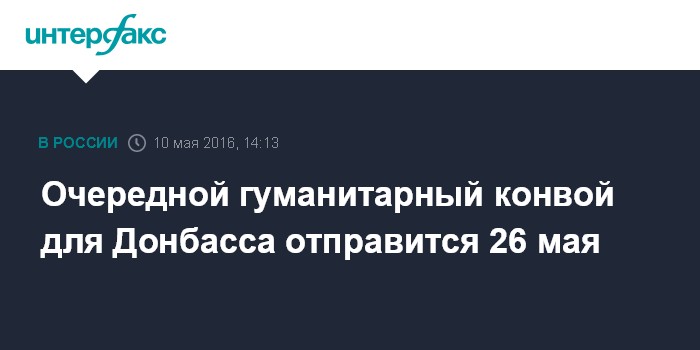 Москва. 10 мая. INTERFAX.RU - Следующий гуманитарный конвой будет отправлен в Донбасс 26 мая, сообщил журналистам во вторник заместитель главы МЧС Владимир Артамонов.