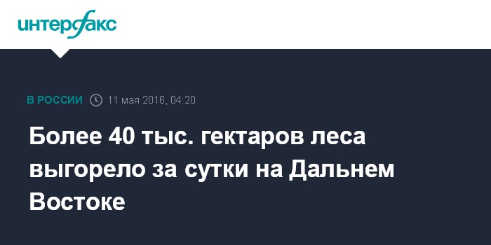 Москва. 11 мая. INTERFAX.RU - Леса горят в пяти регионах Дальнего Востока, за сутки огнем пройдено свыше 40 тысяч гектаров, сообщил в среду департамент лесного хозяйства по ДФО.