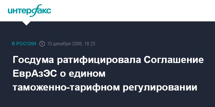 Москва. 10 декабря. INTERFAX.RU - Госдума на пленарном заседании в среду приняла законопроект "О ратификации Соглашения о едином таможенно-тарифном регулировании".