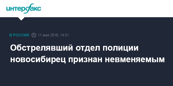 Москва. 11 мая. INTERFAX.RU - Судебно-психиатрическая экспертиза признала невменяемым новосибирца, который осенью 2015 года обстрелял отдел полиции, ранив полицейского, сообщает СУ СКР по Новосибирской области.