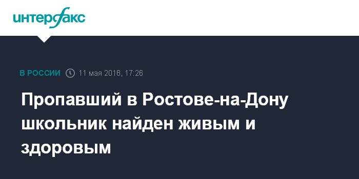 "Чтобы найти школьника, полицейские реализовали комплекс розыскных мероприятий, в которых были задействованы и волонтерские организации. Ребенок был найден на одной из улиц в Первомайском районе Ростова-на-Дону", - сказал собеседник агентства.