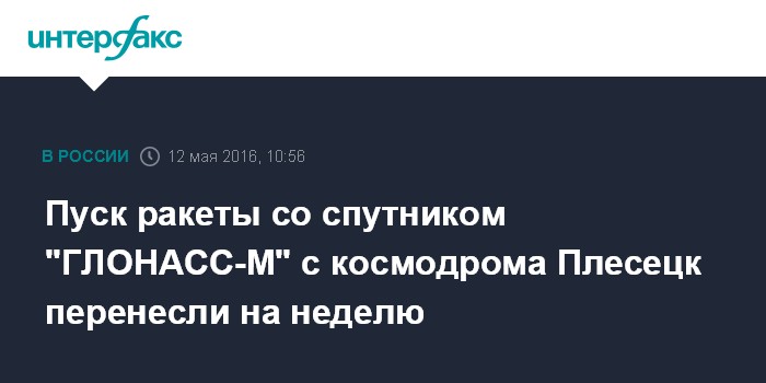 Москва. 12 мая. INTERFAX.RU - Запуск ракеты-носителя "Союз 2.1б" со спутником "ГЛОНАСС-М" с космодрома Плесецк может быть перенесен на неделю, сообщил "Интерфаксу" источник на космодроме.