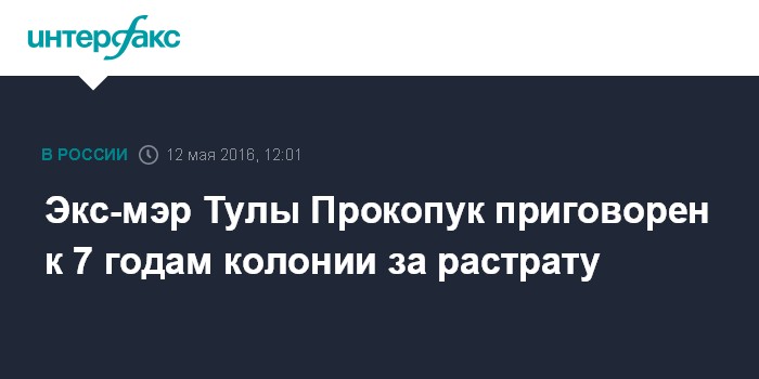 Москва. 12 мая. INTERFAX.RU - Центральный районный суд Тулы в четверг вынес приговор в отношении бывшего главы города Александра Прокопука, обвиняемого в растрате, сообщила "Интерфаксу" представитель СУ СКР по Тульской области Светлана Харламова.