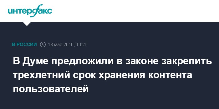 Москва. 13 мая. INTERFAX.RU - Один из авторов "антитеррористического пакета", вынесенного в пятницу на обсуждение Госдумы в первом чтении, Ирина Яровая заявила, что в правительственном подзаконном акте уже предусмотрен трехлетний срок хранения пользовательского контента, и теперь эта норма должна быть закреплена в федеральном законе.