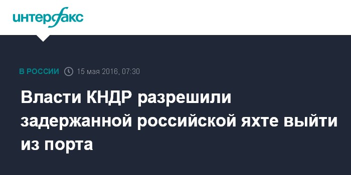 Москва. 15 мая. INTERFAX.RU - Власти Северной Кореи проинформировали российских дипломатов, что задержанной российской яхте "Элфин" разрешено покинуть северокорейский порт Кимчак, сообщил в воскресенье пресс-секретарь посольства РФ в Пхеньяне Денис Самсонов в эфире телеканала "Россия-24".