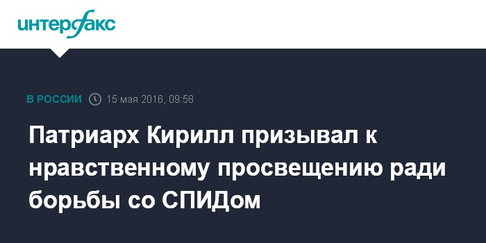 Москва. 15 мая. INTERFAX.RU - Патриарх Московский и всея Руси Кирилл обеспокоен масштабами распространения СПИДа.