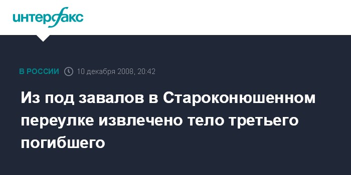Москва. 10 декабря. INTERFAX.RU - В Москве во время проведения спасательных работ в доме № 45 по Староконюшенному переулку, где в среду днем рухнули перекрытия трех этажей, обнаружен третий погибший.