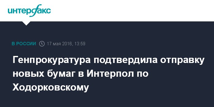 Москва. 17 мая. INTERFAX.RU - Генеральная прокуратура РФ подтвердила факт направления в Интерпол материалов по "делу Ходорковского".