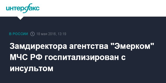 Замдиректора агентства "Эмерком" МЧС РФ госпитализирован с инсультом