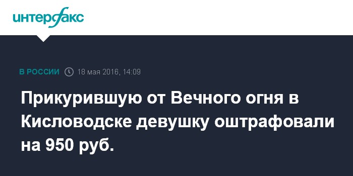 Москва. 18 мая. INTERFAX.RU - Кисловодский городской суд оштрафовал на 950 рублей местную жительницу, поджегшую сигарету от Вечного огня, сообщает пресс-служба Ставропольского краевого суда.